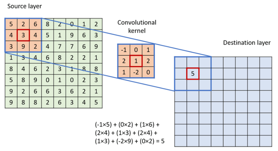 A small filter (e.g., 3×3) slides across the image: